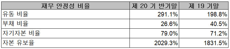 2021년 상반기 말 기준 재무안정성 비율에서는 유동비율 291.1%, 부채비율 26.6%, 자기자본비율 79%, 자본유보율 2,029.3%를 기록하면서 전반적으로 건실하고 안정적인 재무상태를 유지하고 있습니다.