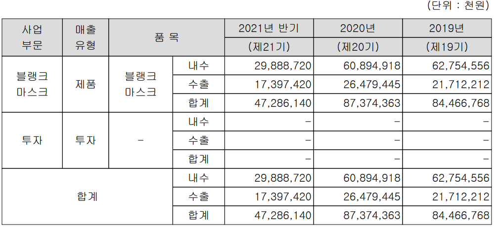당사는 반도체 및 디스플레이 공정에서 포토마스크의 원재료로 패턴을 형상화하기 전의 마스크인 블랭크마스크를 제조, 공급하는 단일 사업부문으로 구성되어 있으며 지난 2020년 매출에서는 디스플레이 60%, 반도체 40%의 매출 비중을 나타냈습니다. 지난 상반기 블랭크 마스크의 매출에서 내수와 수출이 차지하는 비중은 각각 63.2%, 36.8%를 기록했습니다.