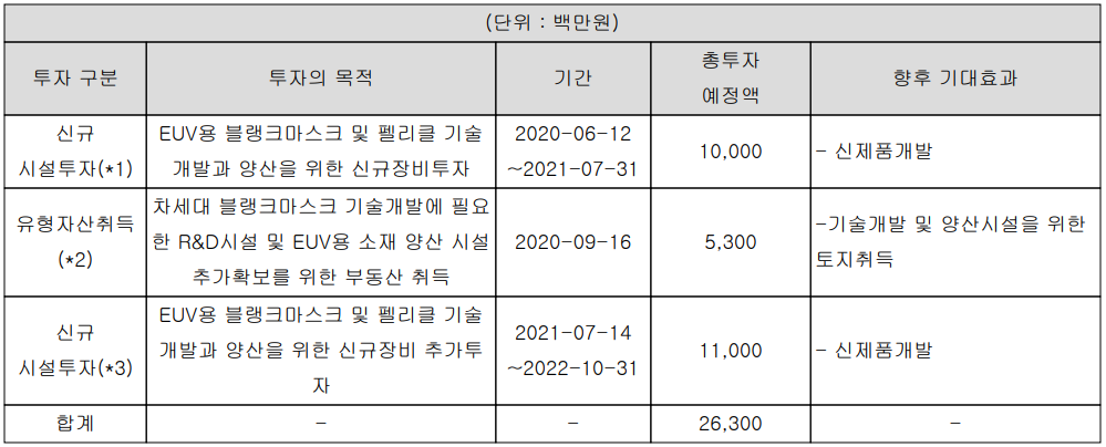 당사는 지난 2020년 9월 차세대 블랭크 마스크 연구 개발을 위한 설비 및 EUV 소재 양산을 위한 신규 투자에 이어 EUV용 블랭크 마스크 및 펠리클 기술 개발과 양산을 위한 110억 원 규모의 추가 투자를 결정하였습니다.