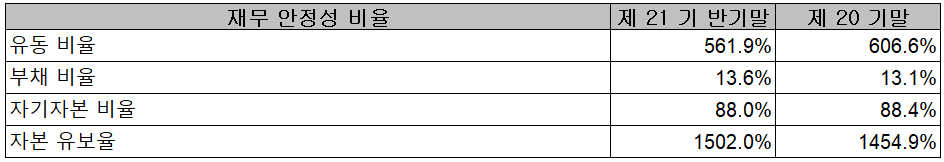 2021년 상반기 말 기준 재무안정성 비율에서는 유동비율 561.9%, 부채비율 13.6%, 자기자본비율 88%, 자본유보율 1,502%를 기록하면서 안정적인 재무상태를 유지하고 있습니다.