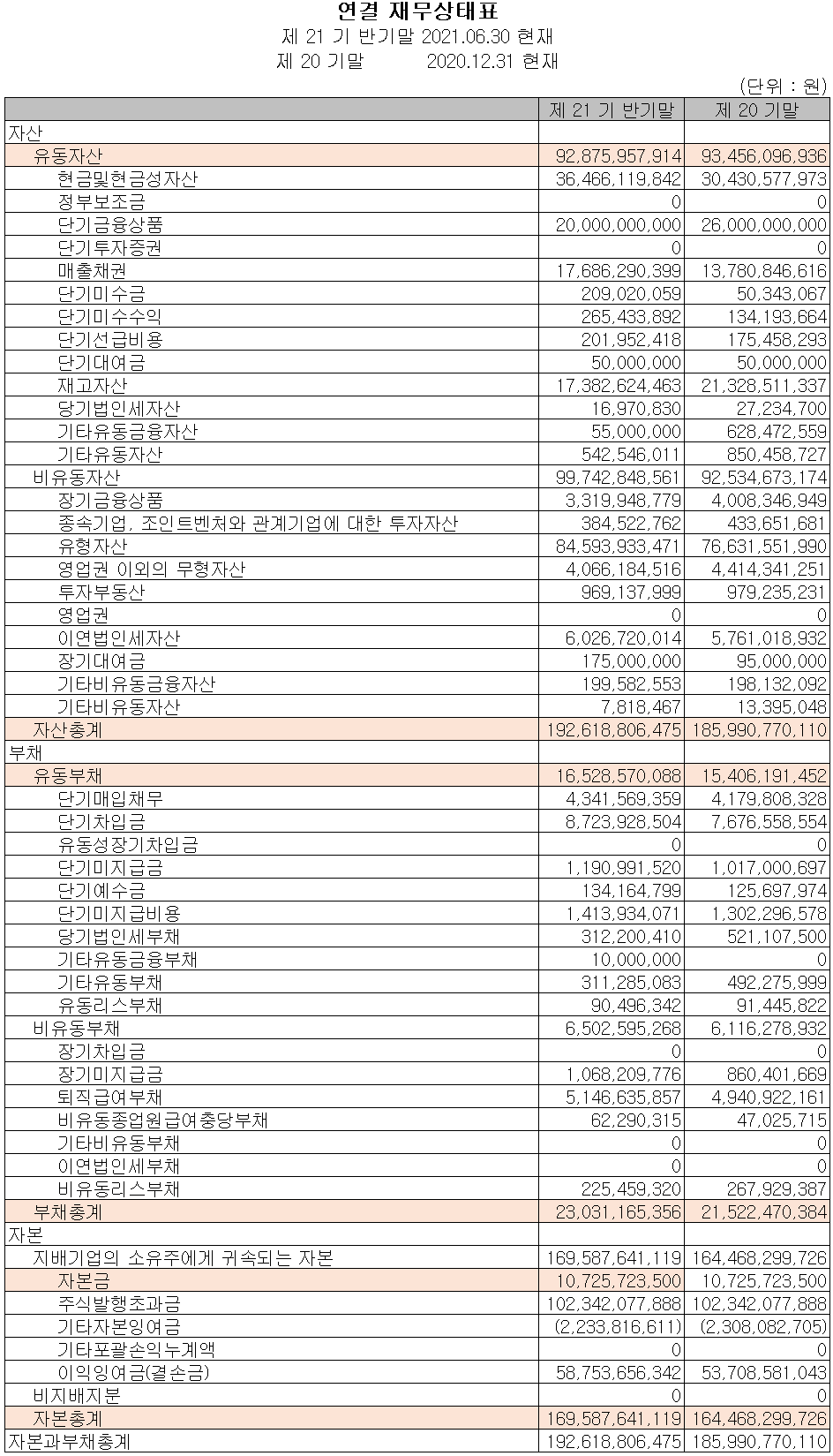 2021년 상반기 말 현재 자산 총계는 전기 말 대비 3.6% 증가한 1,926억 원이며, 부채 총계는 차입금이 늘어나면서 7% 증가한 230억 원을 기록했습니다.