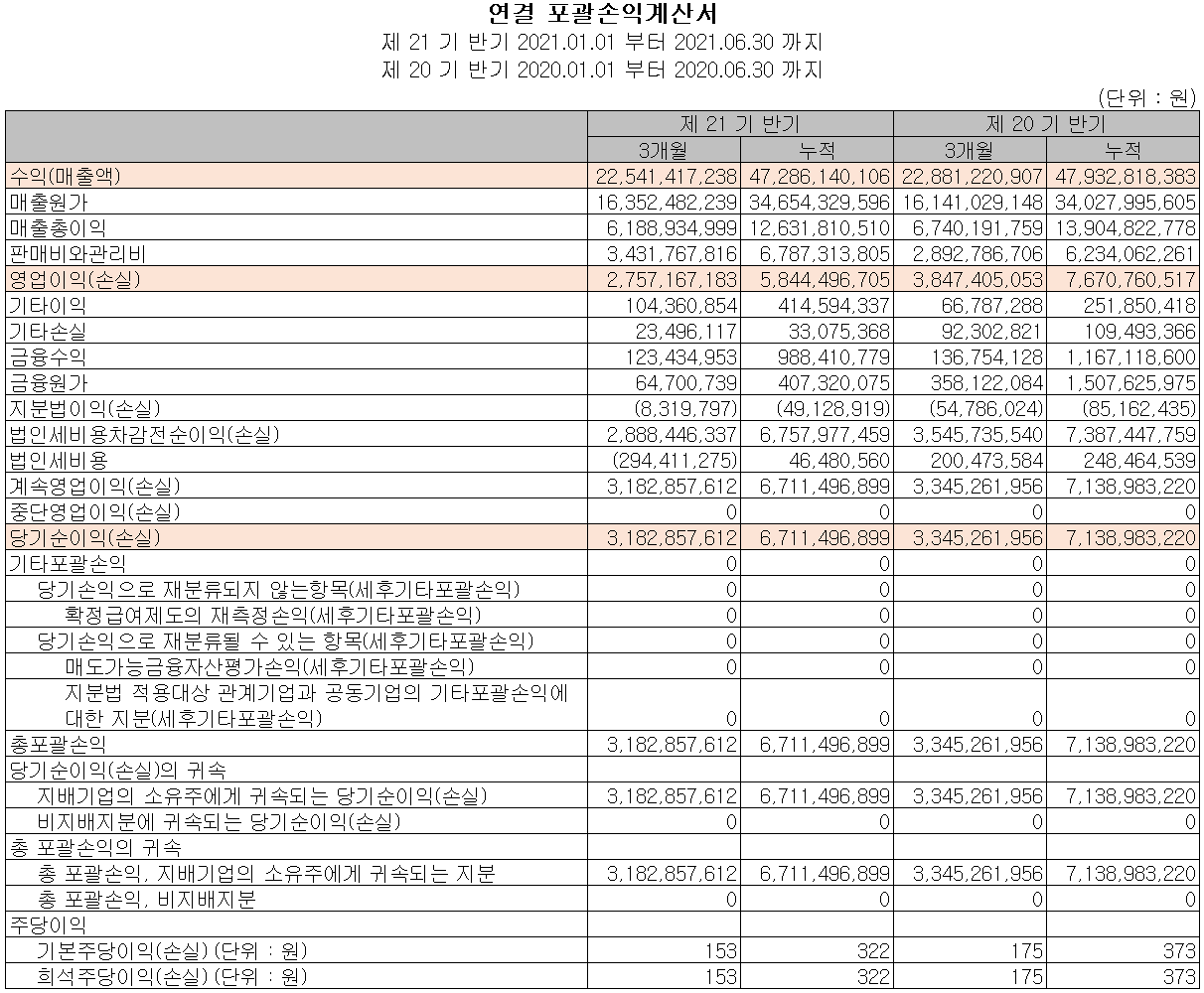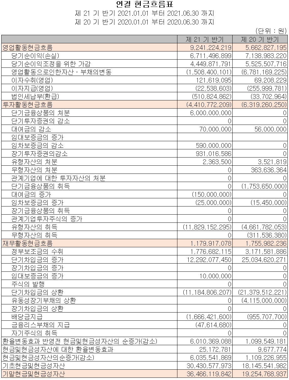 지난 상반기 영업활동 현금흐름에서는 순이익 부분의 감소가 있었으나 운전자산 및 부채의 감소로 인해 총 92억 원의 현금이 유입되었습니다. 투자활동에서는 차세대 블랭크 마스크의 연구 개발을 위한 설비 투자로 유형자산이 증가하면서 총 44억 원의 현금이 유출되었습니다. 재무활동에서는 차입금을 조달하여 부채를 상환하고 배당금을 지급하였습니다. 2021년 6월 30일 현재 현금 및 현금성 자산은 전년 동기 말보다 172억 원이 증가한 365억 원을 보유하고 있습니다.