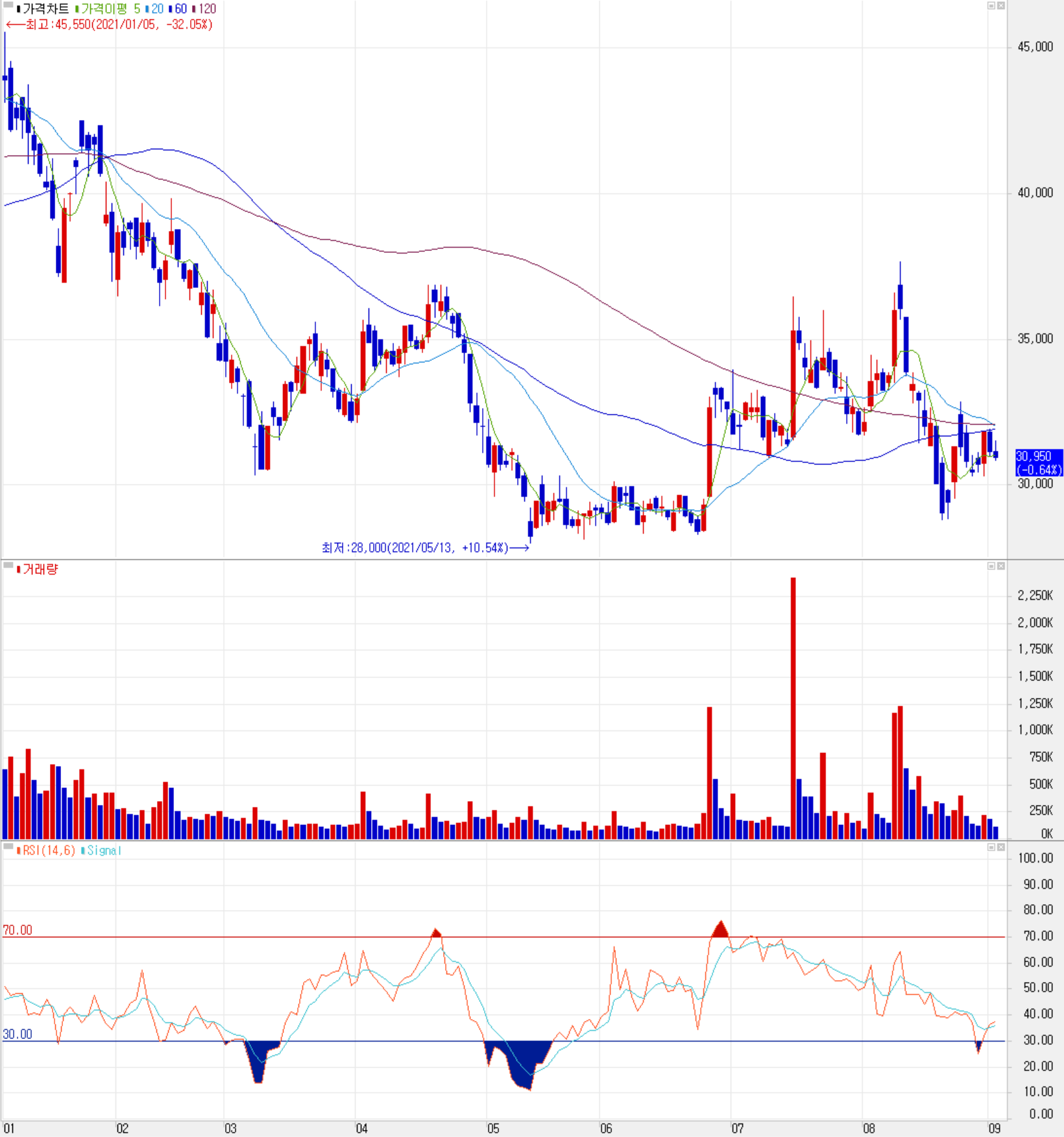 9월 2일 장 종료 기준 당사의 주가는 전 거래일보다 0.64% 내린 30,950원에 거래를 마쳤습니다. 외국인 비중은 2.91%이며, 시가 총액 6,639억 원으로 코스닥 시총 기준 122위 종목입니다.