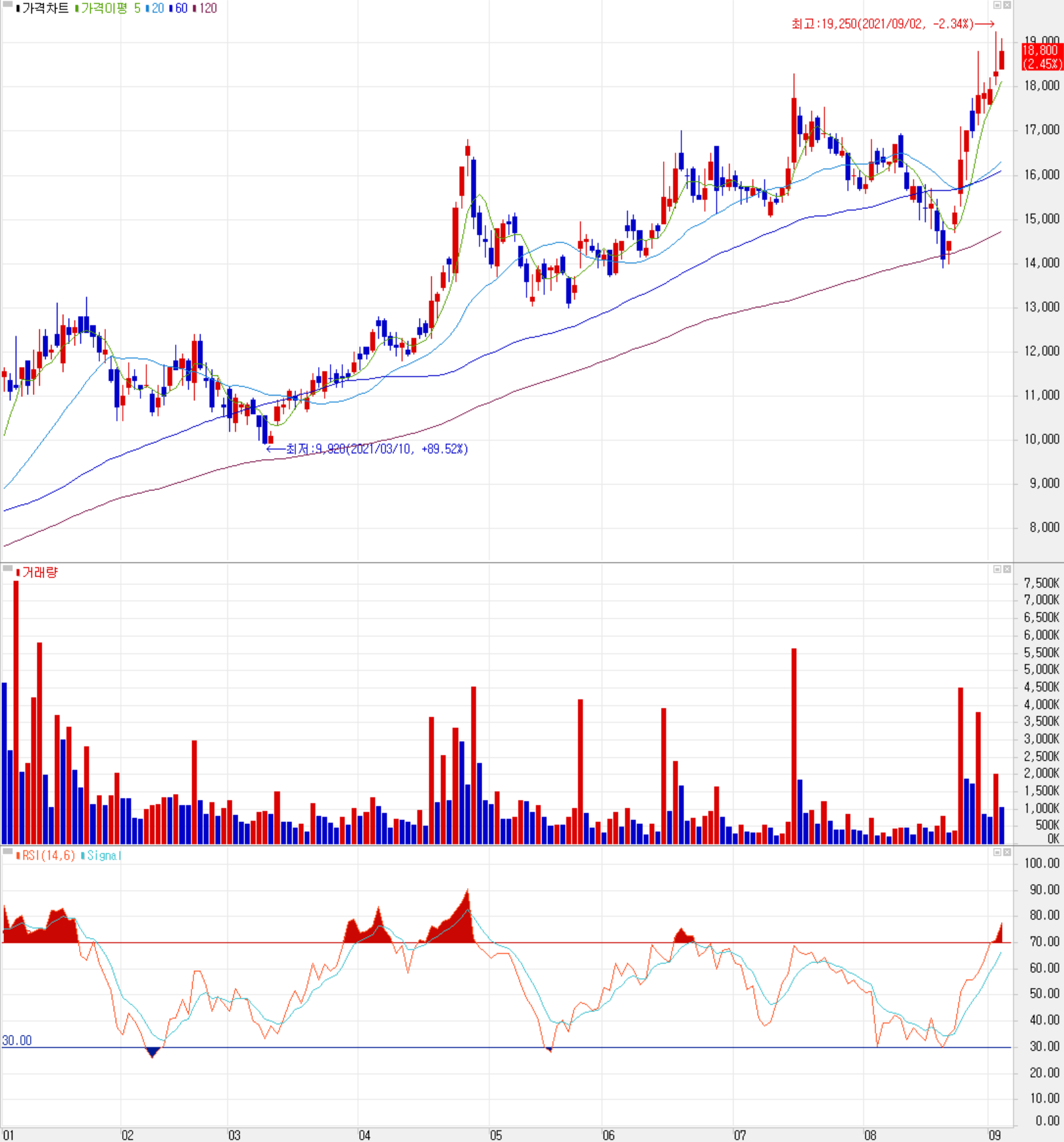 9월 3일 장 종료 기준 당사의 주가는 전 거래일보다 2.45% 오른 18,800원에 거래를 마감했습니다. 외국인 비중은 4.49%이며, 시가 총액은 6,004억 원으로 코스닥 시총 기준 144위 종목입니다.