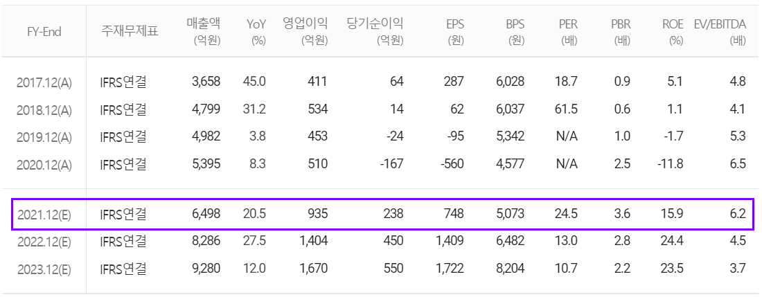 2021년 연간 예상실적에서는 매출액 6,498억 원으로 전년 대비 20.5% 증가하고, 영업이익은 935억 원으로 83.3% 증가할 것으로 추정했습니다. 특히 2021년 12월 30일에는 삼성전자의 AP, RF 관련 설비가 완료되면서 2022년부터 관련 매출이 크게 증가할 것으로 내다보고 있습니다.