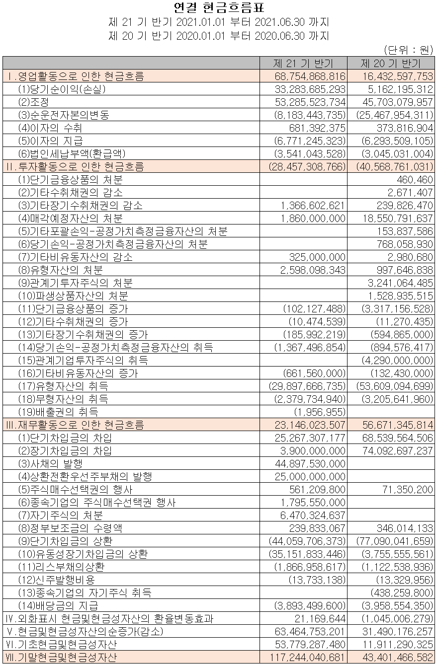 2021년 상반기 영업활동 현금흐름에서는 총 688억 원의 현금이 유입되었습니다. 투자활동에서는 설비 투자로 인한 유무형 자산의 취득 등으로 285억 원의 현금이 유출되었습니다. 재무활동에서는 차입금 차입과 사채를 발행하여 자금을 조달하였고, 당기 부채를 상환하고 배당금을 지급하였습니다. 2021년 6월 30일 기준 현금 및 현금성 자산은 전년 동기 말보다 738억 원이 증가한 1,172억 원을 보유하고 있습니다.