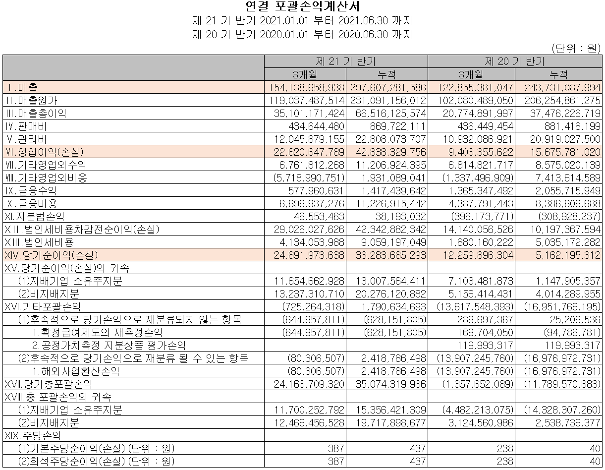 2021년 상반기 말 기준 당사의 자산 총계는 전기보다 10%(768억 원) 증가한 8,416억 원으로 현금 및 현금성 자산과 재고 자산의 증가에 기인합니다. 부채는 6.2%(321억 원) 증가한 5,502억 원으로 장단기 차입금의 증가가 있었습니다.