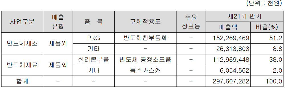 당사와 종속기업의 사업부문은 크게 반도체 후공정에 해당되는 패키징 사업을 영위하는 반도체 제조 부문과 폴리실리콘, 잉곳 등 반도체 원재료를 제조하는 반도체 재료 사업부문으로 구성되어 있습니다. 연결 대상 법인으로는 하나머티리얼즈(주)와 HT MICRON SEMICONDUCTORES S.A., Hana Micron Vina Co., Ltd를 포함하고 있습니다. 지난 상반기 반도체 제조 사업부문의 매출은 1,786억 원으로 전체 매출의 60%를 차지하였으며, 반도체 재료 부문의 매출은 1,190억 원으로 40%의 매출 비중을 기록했습니다.