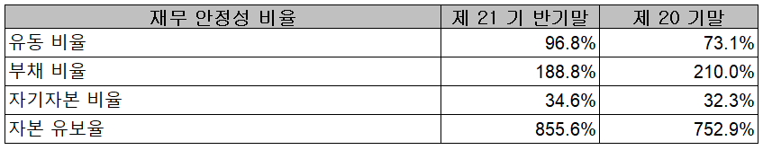 2021년 6월 30일 현재 재무 안정성 비율에서는 유동비율 96.8%, 부채비율 188.8%, 자기자본비율 34.6%, 자본유보율 855.6%를 기록하였습니다.