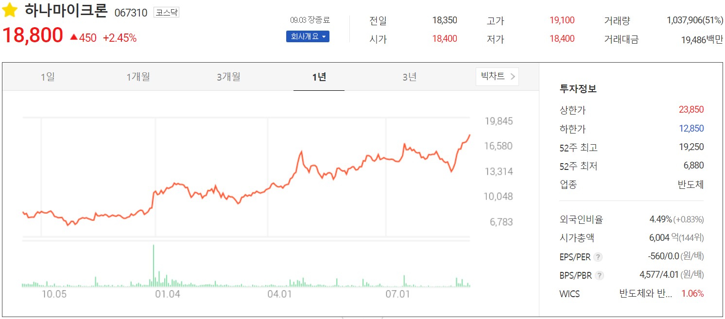 9월 3일 장 종료 기준 당사의 주가는 전 거래일보다 2.45% 오른 18,800원에 거래를 마감했습니다. 외국인 비중은 4.49%이며, 시가 총액은 6,004억 원으로 코스닥 시총 기준 144위 종목입니다.