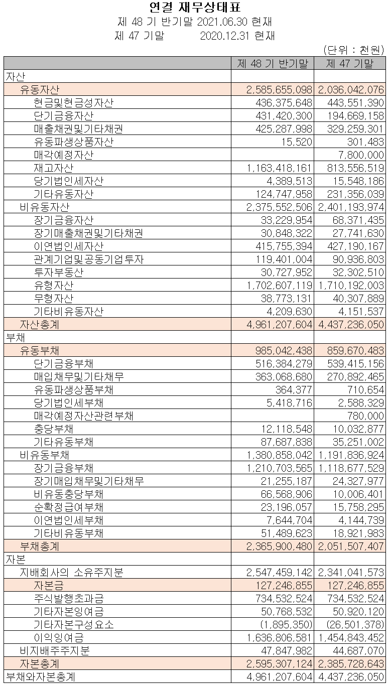 지난 상반기 말 현재 자산 총계는 전기 말 대비 11.8%(5,240억 원) 증가한 4조 9,612억 원으로 현금 및 현금성 자산, 단기금융자산 및 재고자산의 증가에 기인합니다. 부채 총계는 15.3%(3,144억 원) 증가한 2조 3,659억 원으로 매입채무, 장기차입금 등 비유동부채의 증가가 있었습니다.