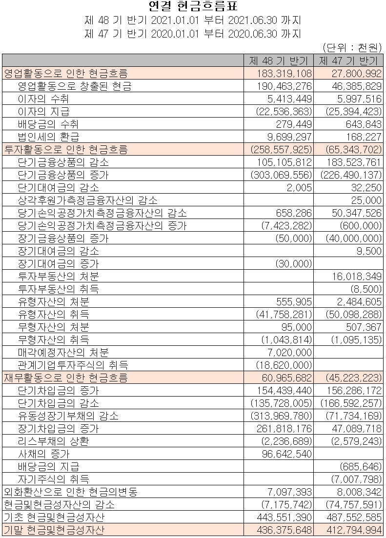 지난 상반기 영업활동 현금흐름에서는 수익의 증가로 인해 총 1,832억 원의 현금이 유입되었습니다. 투자활동에서는 단기 금융상품의 증가 및 유무형 자산의 취득으로 2,586억 원의 현금이 유출되었습니다. 재무활동에서는 차입금 및 사채를 조달하여 당기 부채를 상환하면서 총 610억 원의 현금이 유입되었습니다. 2021년 6월 30일 기준 현금 및 현금성 자산은 전년 동기 말보다 236억 원이 증가한 4,364억 원을 보유하고 있습니다.