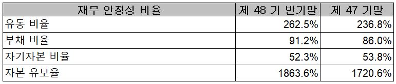 2021년 6월 30일 현재 재무 안정성 비율에서는 유동비율 262.5%, 부채비율 91.2%, 자기자본비율 52.3%, 자본유보율 1,863.6%를 기록하면서 양호한 재무상태를 유지하고 있습니다.