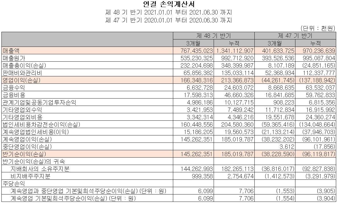 지난 상반기 말 현재 자산 총계는 전기 말 대비 11.8%(5,240억 원) 증가한 4조 9,612억 원으로 현금 및 현금성 자산, 단기금융자산 및 재고자산의 증가에 기인합니다. 부채 총계는 15.3%(3,144억 원) 증가한 2조 3,659억 원으로 매입채무, 장기차입금 등 비유동부채의 증가가 있었습니다.