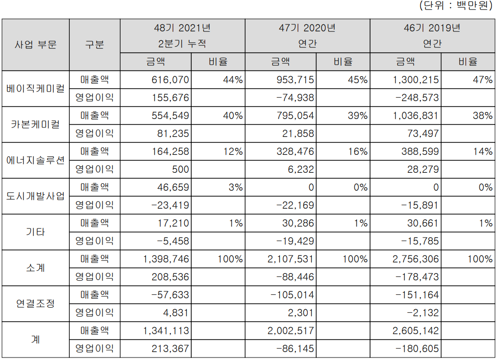 당사는 폴리실리콘, 과산화수소를 주력으로 하는 베이직케미컬 부문, 핏치, 카본블랙을 제조하는 카본케미컬 부문 그리고 에너지솔루션과 도시개발 사업부문 등으로 구성되어 있습니다.