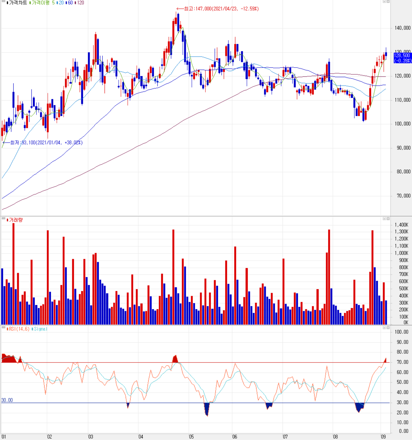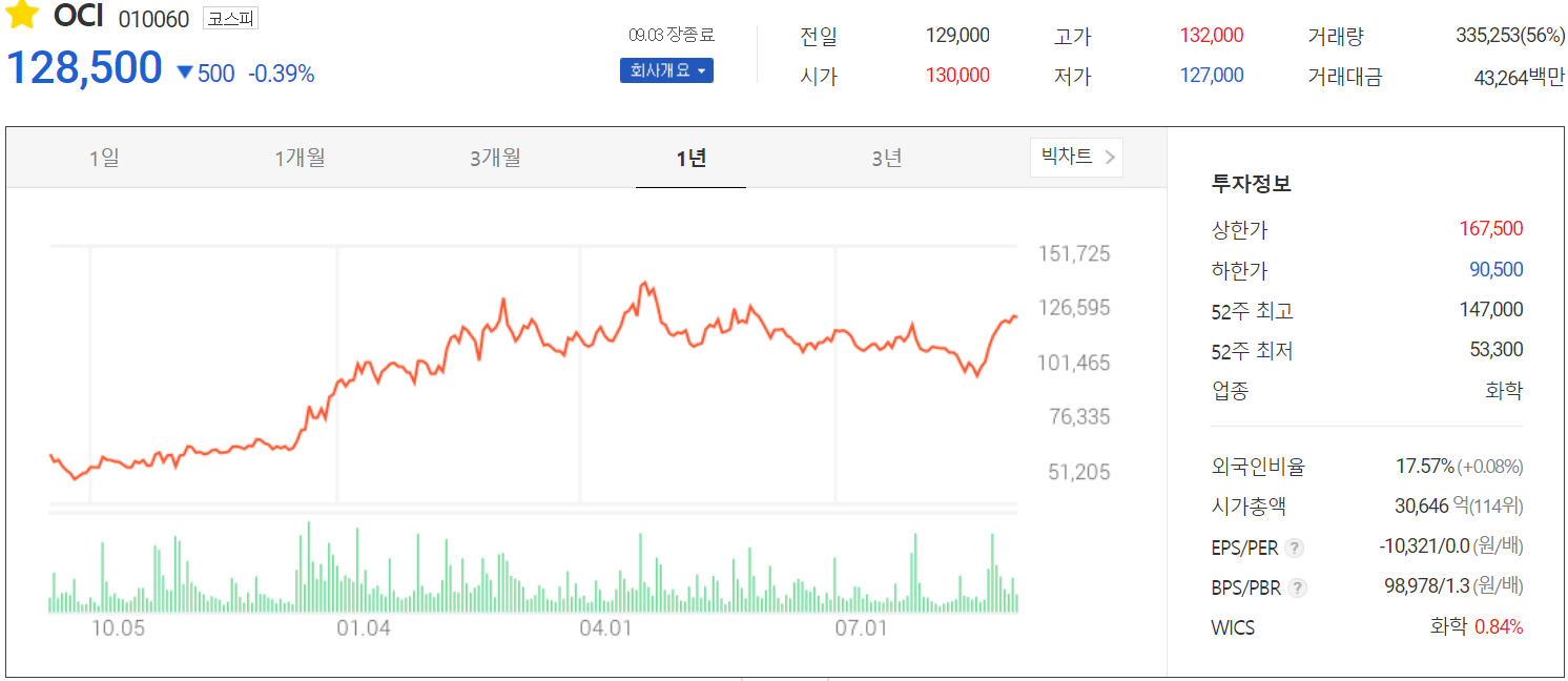 9월 3일 장 종료 기준 당사의 주가는 전 거래일보다 0.39% 내린 128,500원에 거래를 마쳤으며 연중 최고점 대비 12.59% 내린 상태입니다. 외국인 비중은 17.57%이며 시가총액 3조 646억 원으로 코스피 시총 기준 114위 종목입니다.