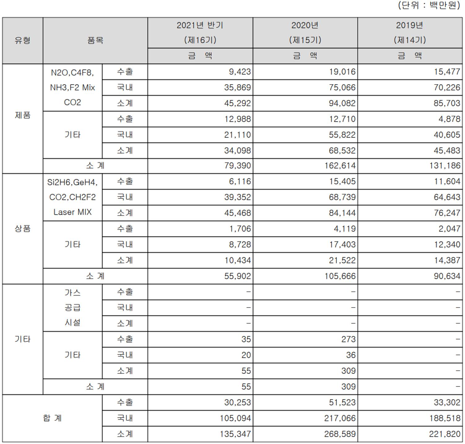 당사는 반도체, 디스플레이 및 태양전지의 제조용 특수가스를 제조하는 단일 사업부문으로 되어 있으며, 세부적으로는 증착 공정, Cleaning 공정, Diffusion(확산) 공정, 식각 공정 등 대부분의 공정에 적용되고 있습니다. 지난 상반기 매출에서 수출과 내수의 비중은 각각 22.4%, 77.6%를 기록했습니다.