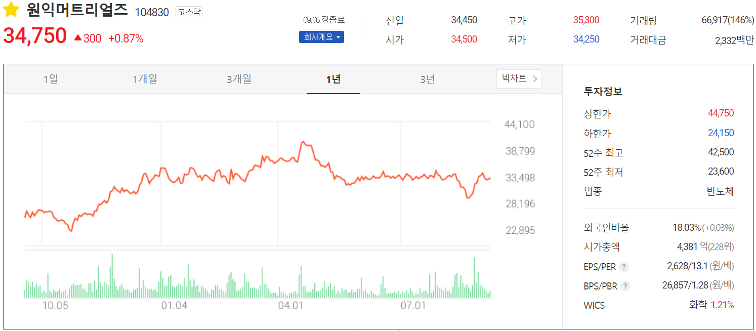 9월 6일 장 종료 기준 당사의 주가는 전 거래일보다 0.87% 오른 34,750원에 거래를 마감했습니다. 외국인 비중은 18.03%이며, 시가 총액 4,381억 원으로 코스닥 시총 기준 228위 종목입니다.