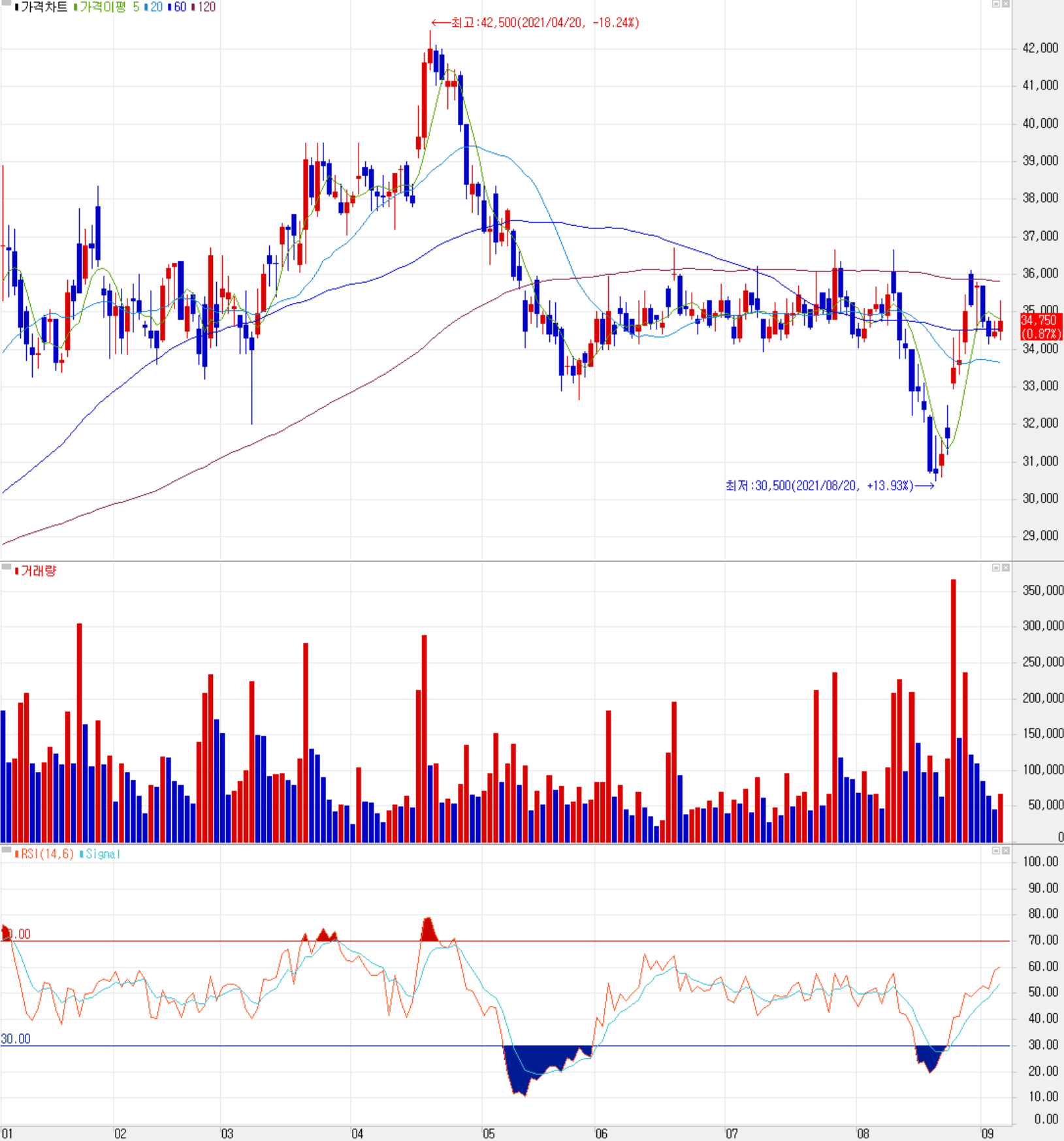 4월말부터 5월까지 큰 조정을 받은 당사의 주가는 8월 중순까지 2개월 넘게 35,000원 부근에서 횡보하다가 반도체 D램 가격 하락 전망에 따라 또 한 번 조정을 받으면서 연중 최저점인 30,500원까지 내려갔고 이후 삼성전자 240조 투자 소식 등에 힘입어 반등하면서 다시 35,000원 대에서 가격이 형성되고 있습니다. 최근 수급에서는 기관의 매도세가 가격 하락을 부추겼으며, 외국인과 개인은 매수 우위를 유지하고 있습니다. 차트 소견 및 예상 실적을 종합한 개인적인 목표주가는 42,000원으로 설정하였습니다.