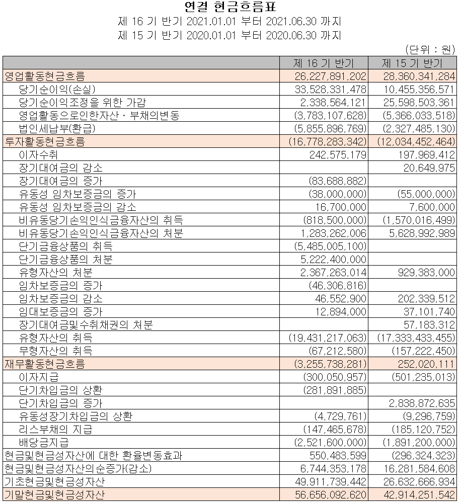 지난 상반기 영업활동 현금흐름에서는 순이익의 증가로 총 262억 원의 현금이 유입되었습니다. 투자활동에서는 금융상품 및 유무형 자산의 취득으로 총 168억 원의 현금이 유출되었습니다. 재무활동에서는 당기 부채를 상환하고, 배당금을 지급하였습니다. 2021년 6월 30일 기준 현금 및 현금성 자산은 567억 원을 보유하고 있습니다.