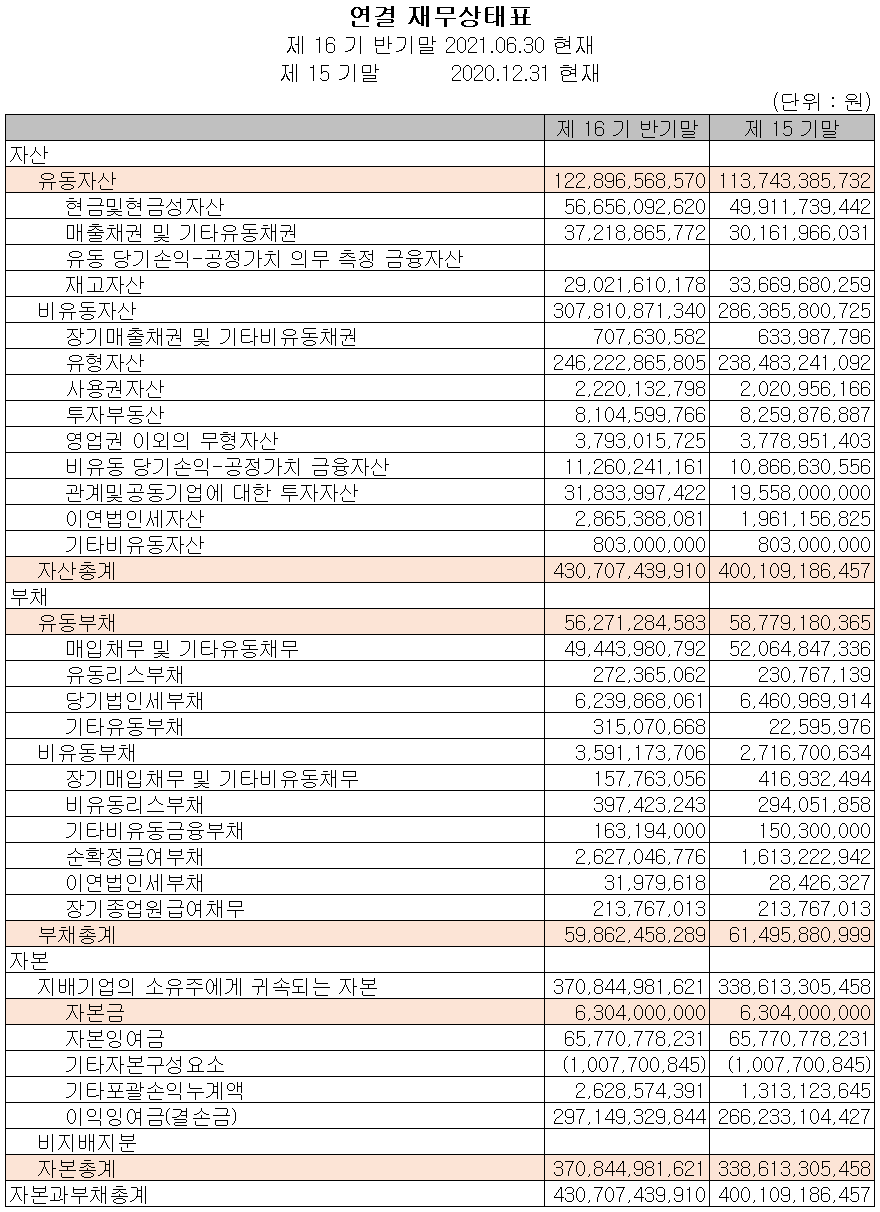 2021년 상반기 말 현재 자산 총계는 전기 말보다 7.6%(306억 원) 늘어난 4,307억 원으로 현금 및 현금성 자산, 매출채권 및 관계기업 투자자산의 증가에 기인합니다. 부채는 2.7%가 감소한 599억 원을 기록했습니다. 자기 자본은 이익의 증가 등으로 인해 전기 대비 9.5% 증가한 3,708억 원을 기록했습니다.