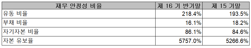 2021년 6월 30일 기준 재무 안정성 비율에서는 유동비율 218.4%, 부채비율 16.1%, 자기자본비율 86.1%, 자본 유보율 5,757%를 기록하면서 건실하고 안정적인 재무상태를 유지하고 있습니다.