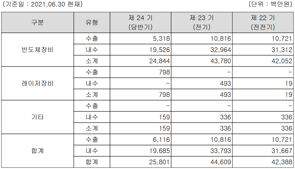 당사는 Burn-In Sorter LED Probe, LED Sorter  장비 등 반도체 및 디스플레이 공정용 테스트 핸들러 장비와 Vision Sinspection, Gantry Tape & Reel, Flip Chip Handler 등 반도체 후공정용 시스템을 제조, 공급하고 있습니다. 또한 지난 2020년부터 유리 제작업체와 협력하여 레이저를 이용한 초박막유리 절단 자동화 기기를 개발, 공급하고 있습니다. 지난 상반기 반도체 장비의 매출은 248억 원으로 전체 매출의 96.3%를 차지하였으며, 레이저 장비의 매출은 8억 원을 기록하면서 3.1%의 매출 비중을 나타냈습니다.