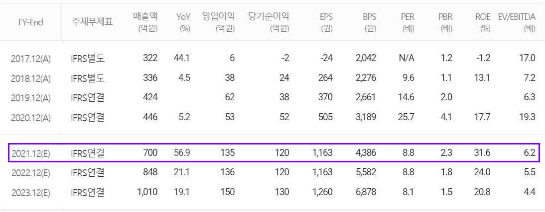 2021년 연간 예상 실적에서는 매출액 700억 원으로 전년 대비 56.9% 증가하고, 영업이익은 135억 원으로 155% 증가할 것으로 추정했습니다. 번인 소터의 독보적인 공급을 기반으로 2021년 후반기부터 업체별로 적용 예정인 DDR5 메모리의 수요 증가에 따라 향후 당사의 꾸준한 성장이 예상됩니다.