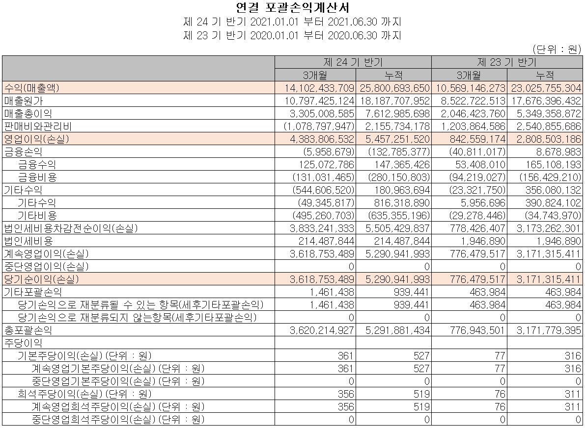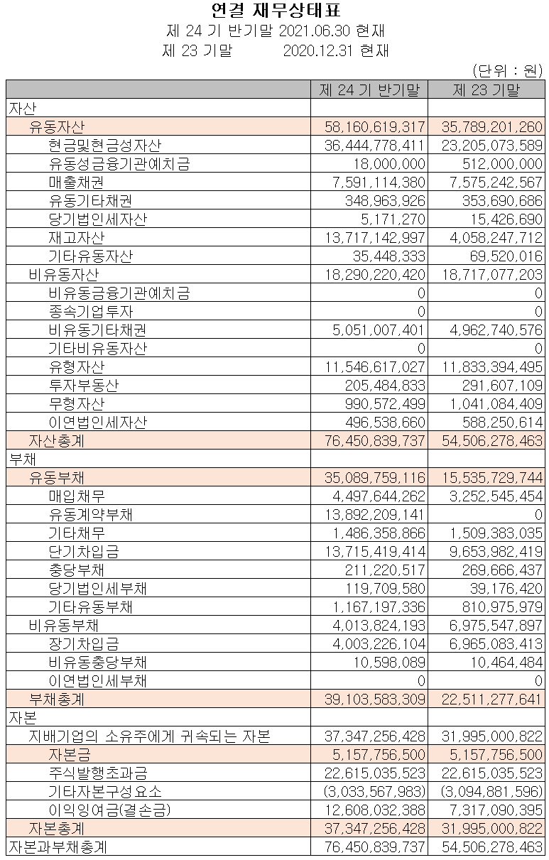 2021년 상반기 말 현재 자산 총계는 전기말보다 40.3%(219억 원) 증가한 765억 원으로 현금 및 현금성 자산, 재고 자산의 증가에 기인합니다. 부채는 73.7%(166억 원)가 증가하면서 391억 원으로 유동성 계약 부채의 증가가 있었습니다. 자본 총계는 이익의 증가로 인해 16.7% 증가하면서 373억 원을 기록했습니다.