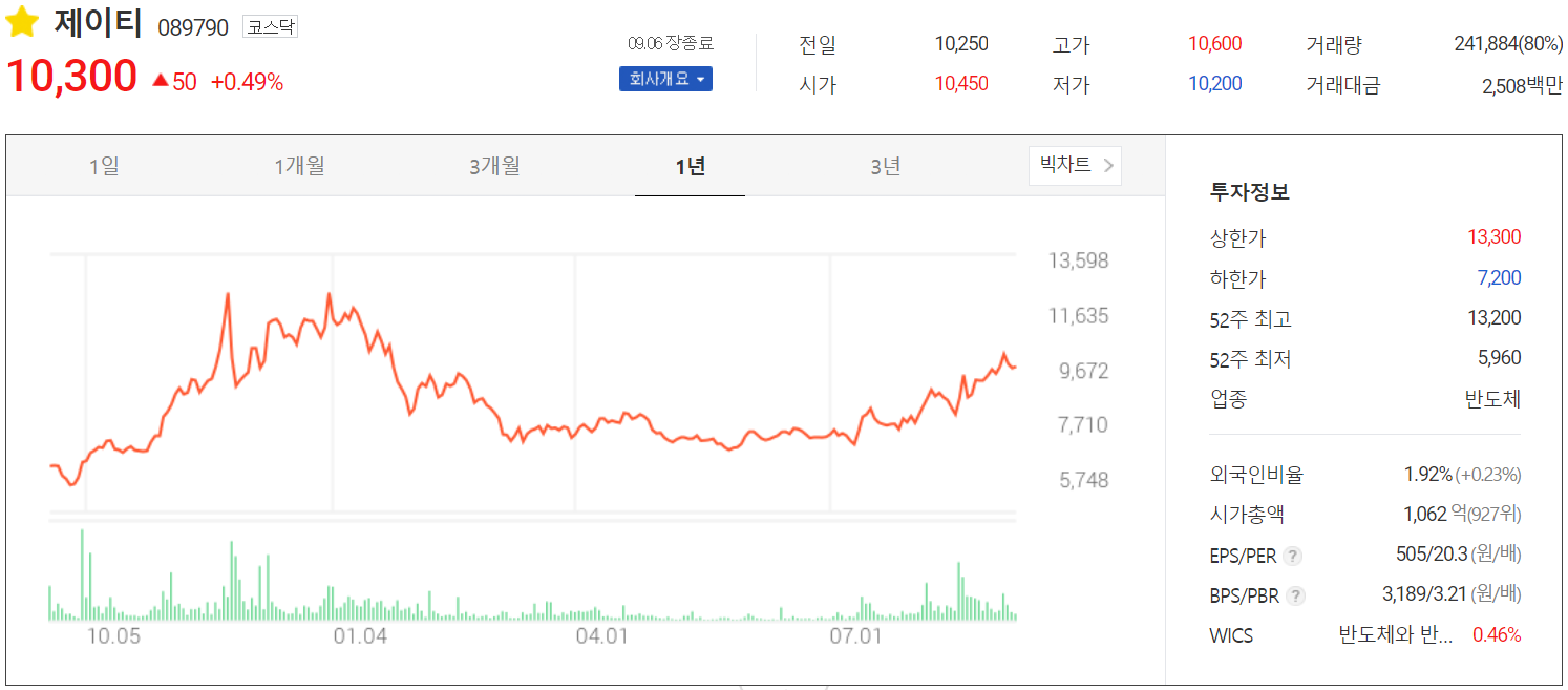 9월 6일 장 종료 기준 당사의 주가는 전 거래일보다 0.49% 오른 10,300원에 거래가 종료되었습니다. 외국인 비중은 1.92%이며, 시가 총액 1,062억 원으로 코스닥 시총 기준 927위 종목입니다.