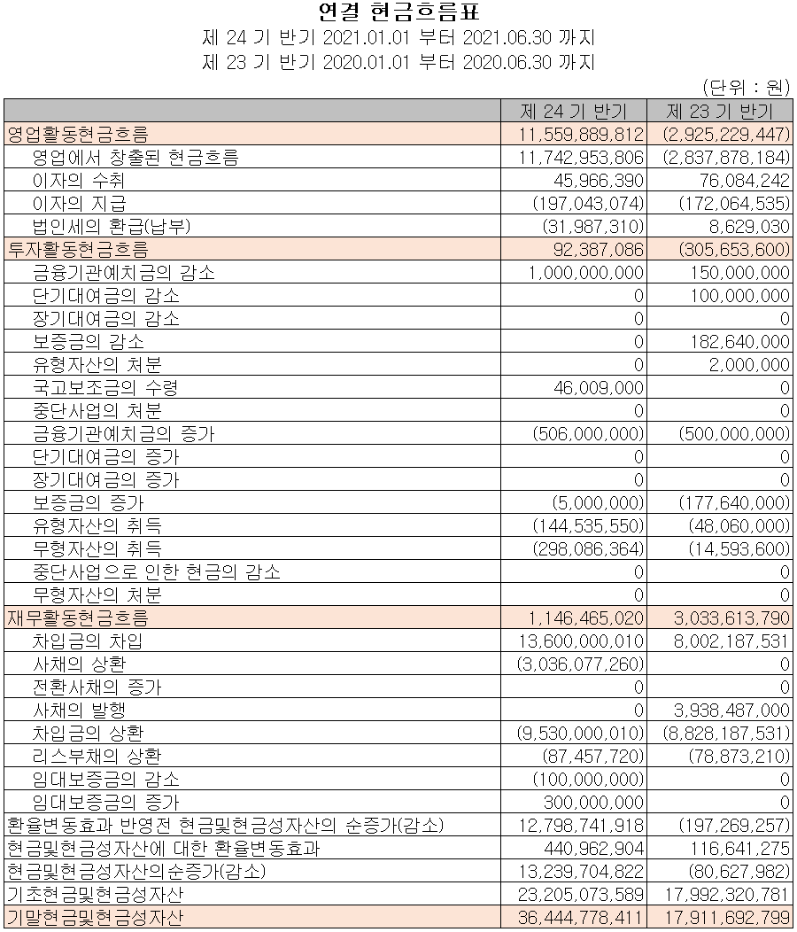 지난 상반기 영업활동 현금흐름에서는 당분기 이익의 증가로 총 116억 원의 현금이 유입되었습니다. 투자활동에서는 소규모 유무형 자산의 증가가 있었으나 금융 예치금의 사용으로 0.9억 원의 현금이 유입되었습니다. 재무활동에서는 차입금을 조달하여 당기 부채를 상환하면서 총 11억 원의 현금이 유입되었습니다. 2021년 6월 30일 기준 현금 및 현금성 자산은 전년 동기 말보다 185억 원이 증가한 364억 원을 보유하고 있습니다.