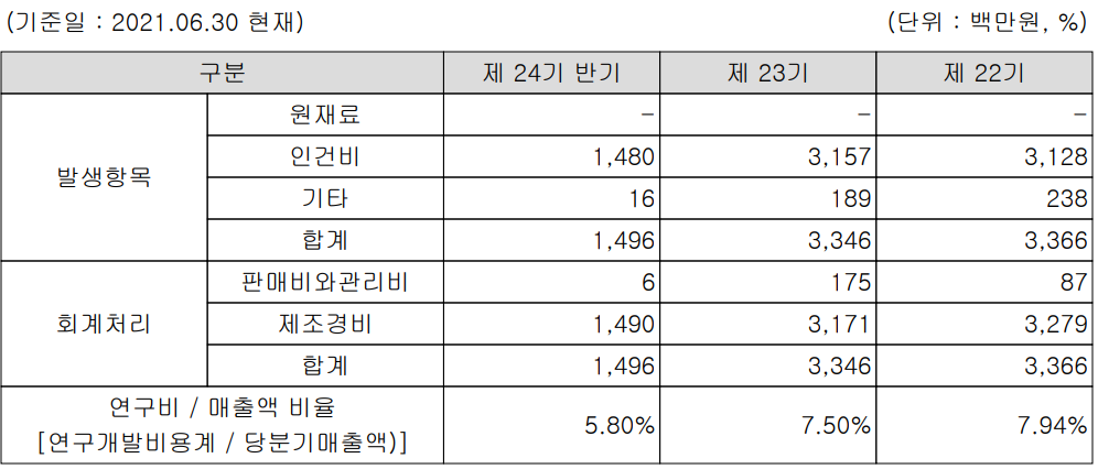 당사는 지난 상반기 매출액의 5.8%에 해당하는 15억 원 규모의 비용을 연구개발에 투입하면서 기존 장비의 경쟁력 강화 및 신규 제품의 선행 개발을 지속하고 있습니다.