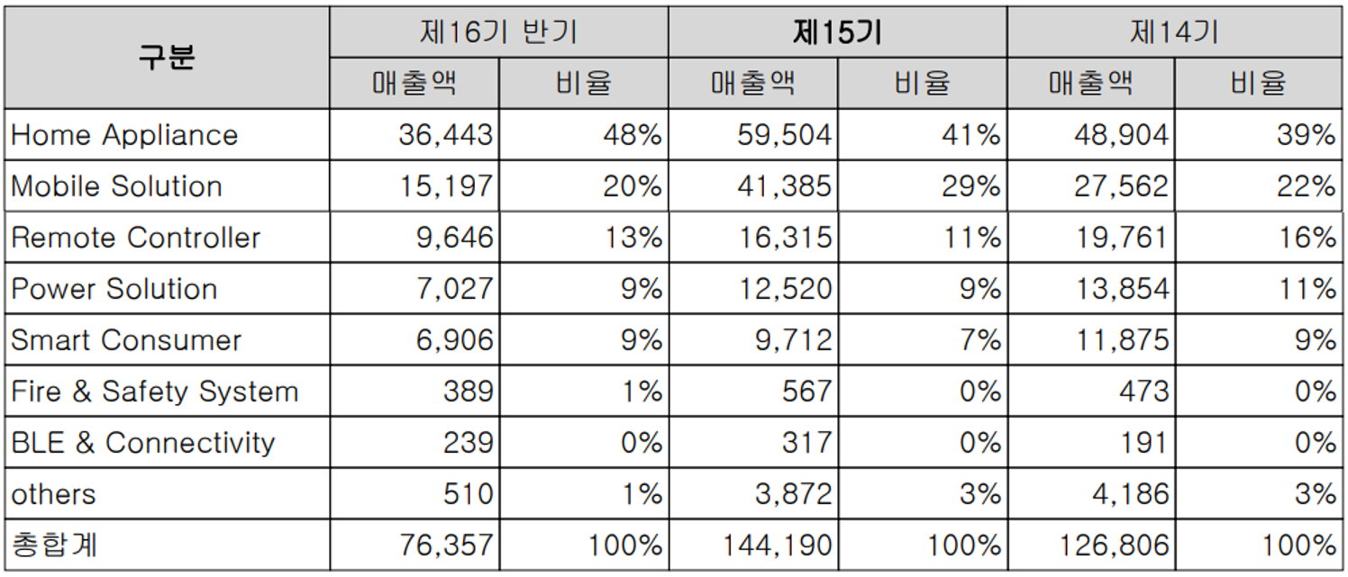 당사는 백색 가전을 기반으로 한 400여 가지의 다양한 전자제품에 적용되는 MCU(Micro Controller Unit)의 설계, 제조 및 공급을 하는 기업입니다. 지난 상반기 가전 부문의 매출은 364억 원으로 전체 매출의 48%를 차지하였으며, 모바일 부문은 152억 원으로 20%, 리모컨은 96억 원으로 13% 등을 기록하였습니다. 전체 매출에서 내수와 수출이 차지하는 비중은 각각 57%, 43%를 기록했습니다.