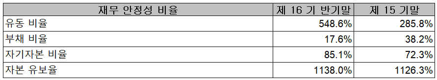 2021년 상반기 말 현재 재무안정성 비율에서는 유동비율 548.6%, 부채비율 17.6%, 자기자본비율 85.1%, 자본유보율 1,138%를 기록하면서 풍부한 유동성을 비롯한 안정적인 재무구조를 유지하고 있습니다.
