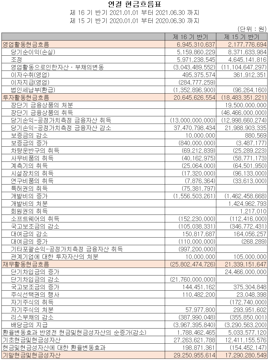 지난 상반기 영업활동 현금흐름에서는 69억 원의 현금이 유입되면서 꾸준히 현금을 창출하고 있습니다. 투자활동에서는 공정가치측정금융자산 등 금융자산의 감소로 인해 206억 원의 현금이 유입되었습니다. 재무활동에서는 단기차입금 등 부채가 감소했고 배당금을 지급하면서 총 258억 원의 현금이 유출되었습니다. 2021년 6월 30일 기준 현금 및 현금성 자산은 전년 동기 말보다 120억 원 증가한 293억 원을 보유하고 있습니다.