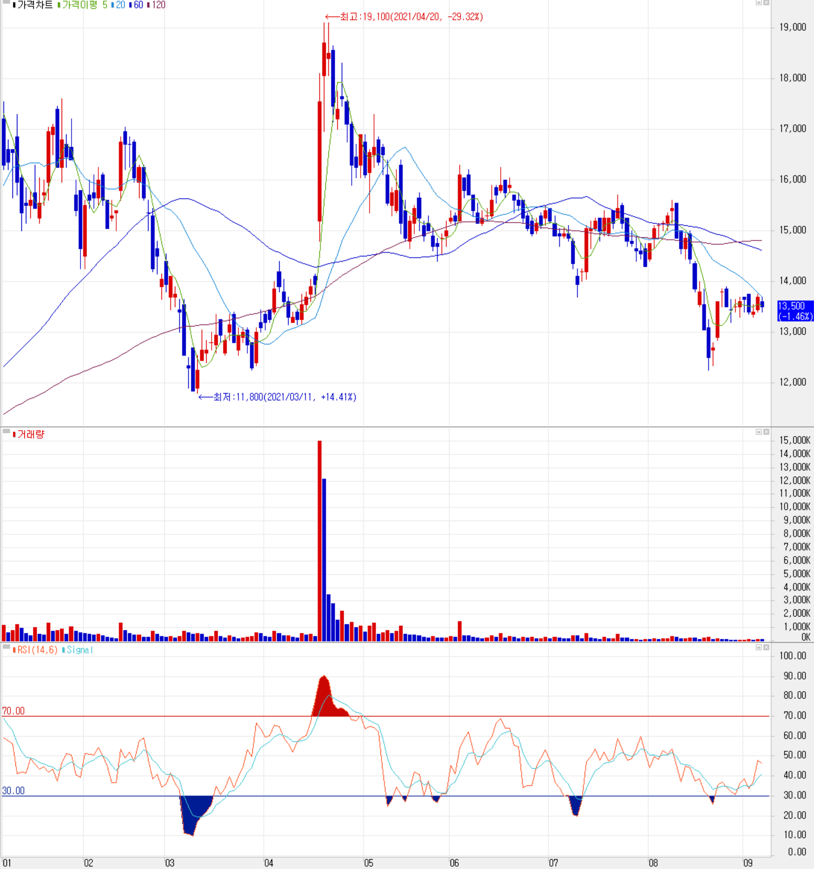 9월 7일 장 종료 기준 당사의 주가는 전 거래일보다 1.46% 내린 13,500원에 거래를 마감했습니다. 외국인 비중은 1.4%이며, 시가 총액 2,357억 원으로 코스닥 시총 상위 455위 종목입니다.