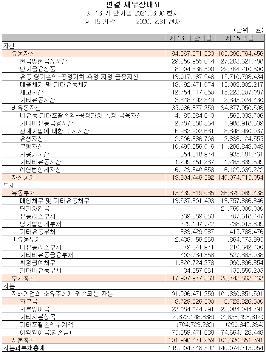 2021년 6월 30일 현재 자산 총계는 전기 말 대비 14.4%(202억 원) 감소한 1,199억 원으로 단기금융상품 및 재고자산의 감소에 기인합니다. 부채 총계는 53.8%(208억 원) 줄어든 179억 원으로 단기 차입금의 상환에 따른 감소가 있었습니다.