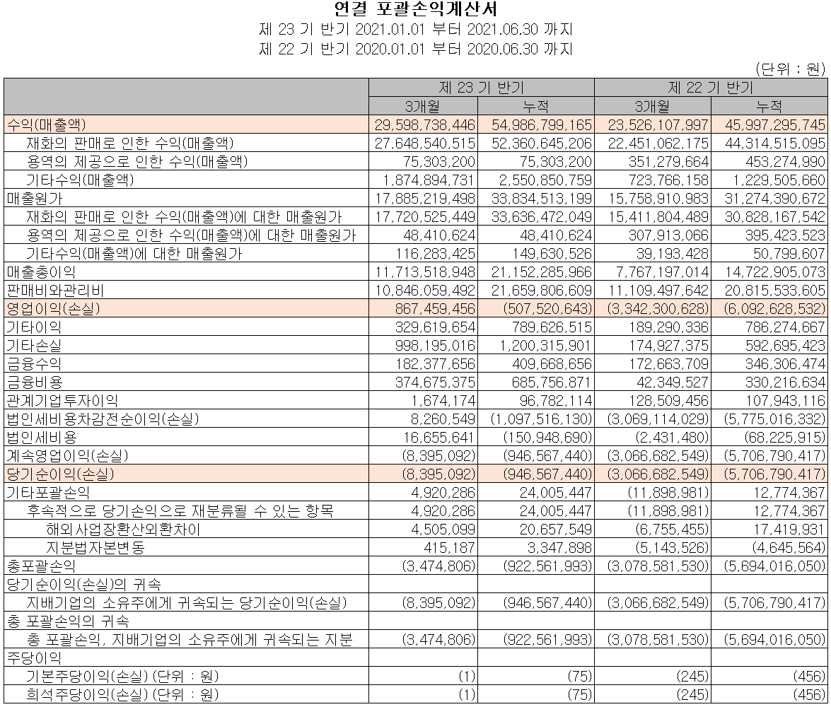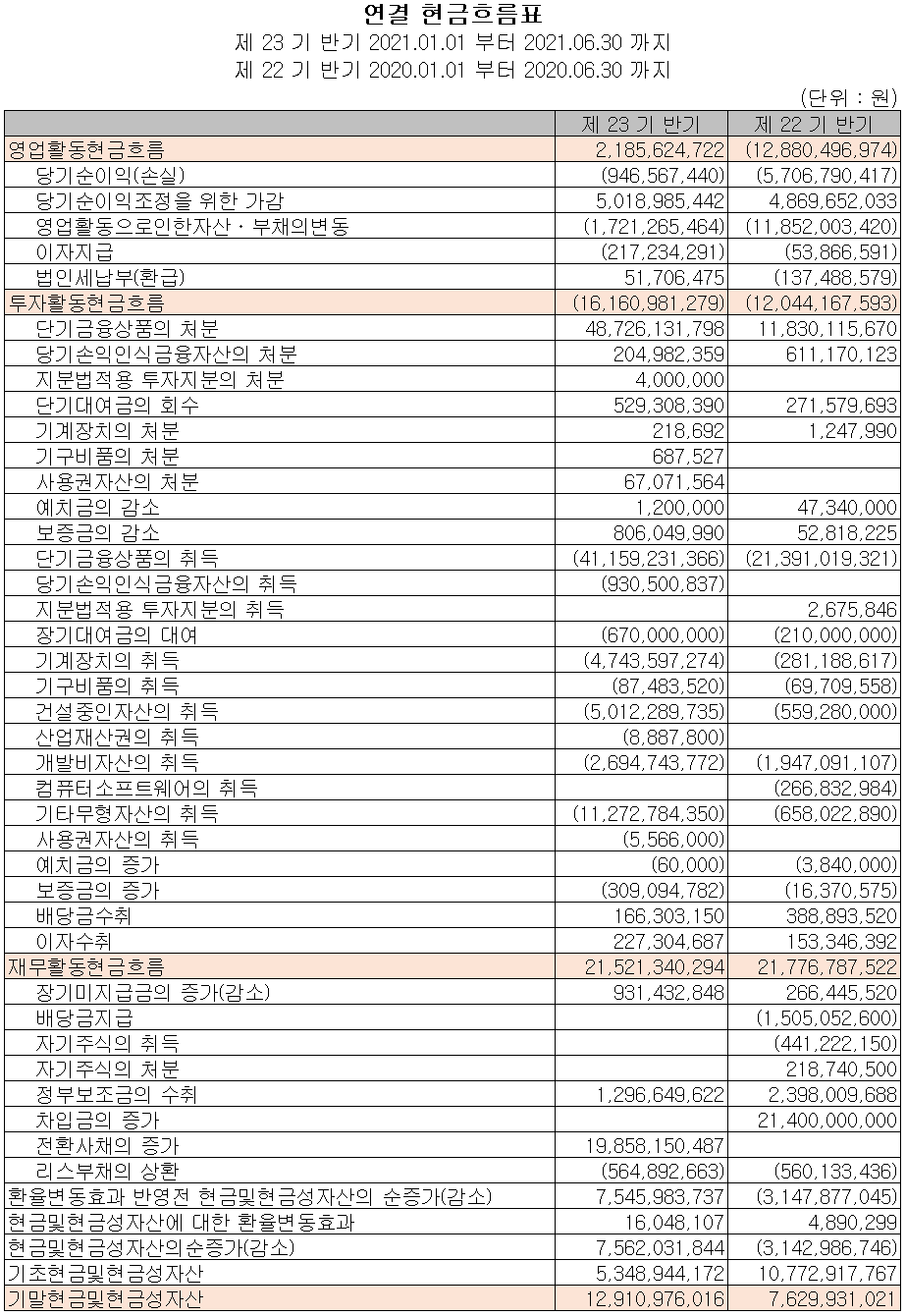 지난 상반기 영업활동 현금흐름에서는 22억 원의 현금이 유입되었습니다. 투자활동에서는 유무형 자산의 취득으로 162억 원의 현금이 유출되었습니다. 재무활동에서는 전환 사채의 증가로 215억 원의 현금이 유입되었습니다. 2021년 6월 30일 기준 현금 및 현금성 자산은 전년 동기 말보다 53억 원이 감소한 129억 원을 보유하고 있습니다.