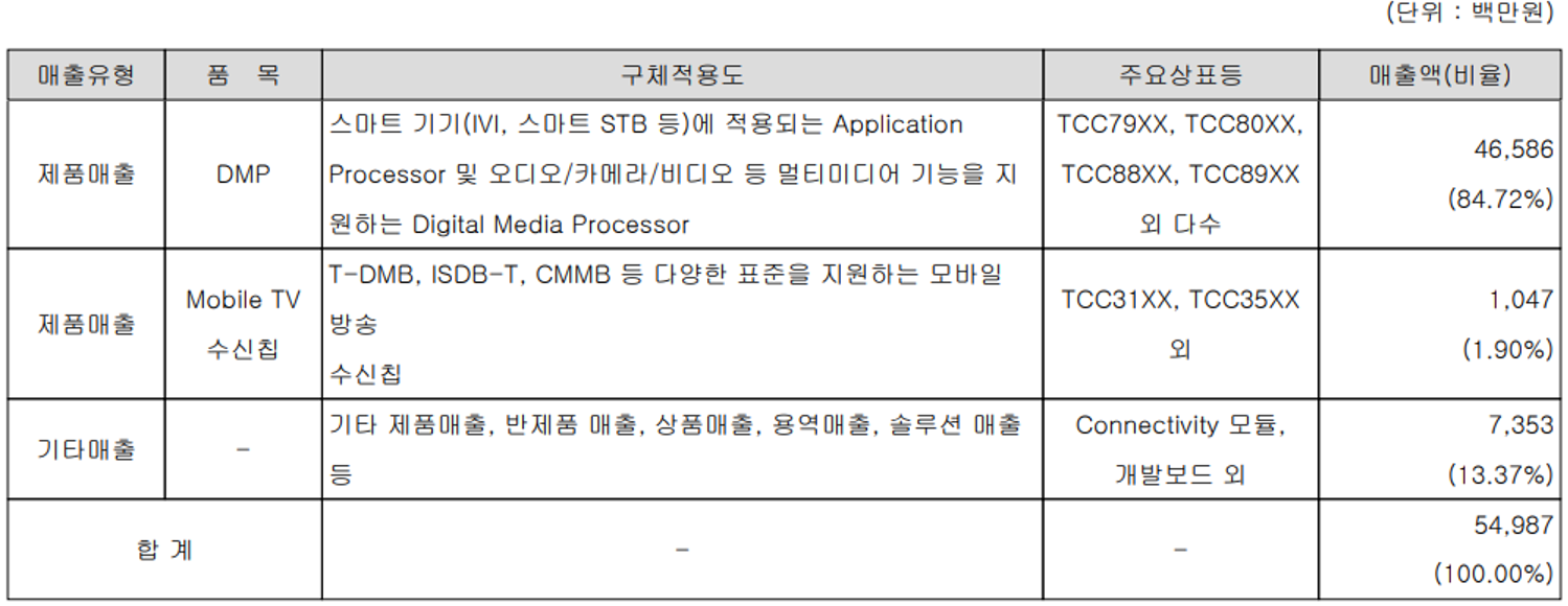 당사는 반도체 팹리스(Fabless) 업체로서 스마트기기, 오디오, 비디오, 카메라 등 디지털 미디어 프로세서(DMP)가 필요한 멀티미디어 부문과 모바일 방송용 통신 칩 등의 설계 및 개발을 전문으로 합니다. 지난 상반기 DMP 부문 매출은 466억 원으로 전체 매출의 84.72%를 차지하였으며, 모바일 수신 칩의 매출은 10억 원으로 1.9%의 매출 비중을 기록했습니다.