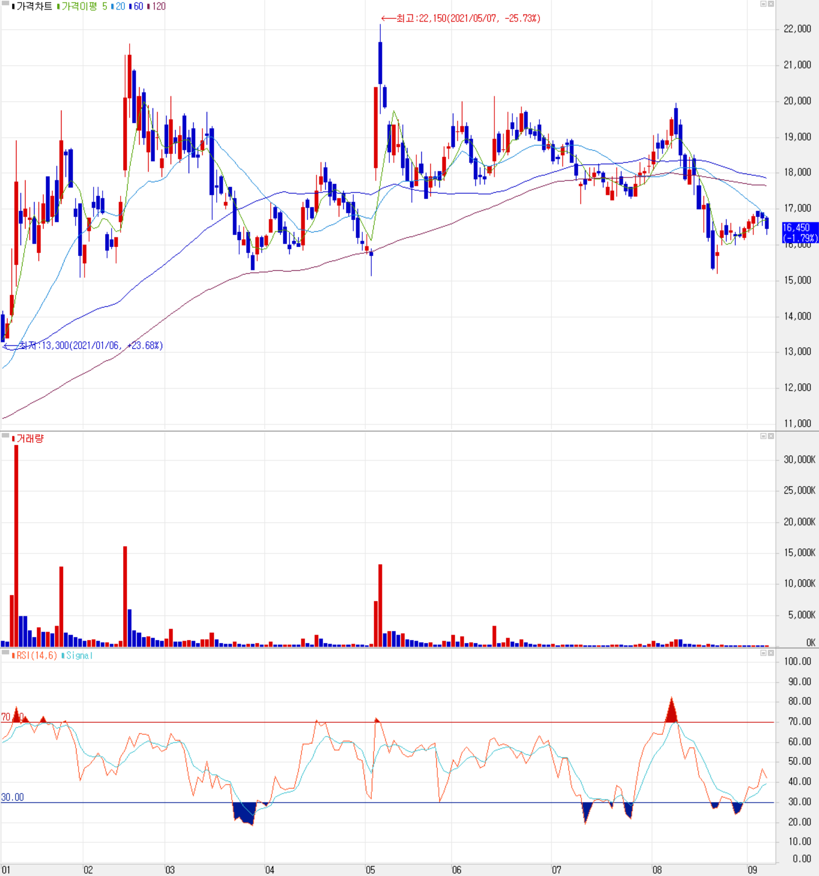 9월 7일 장 종료 기준 당사의 주가는 전일보다 1.79% 내린 16,450원에 거래를 마감했습니다. 외국인 비중은 0.23%이며 시가 총액 2,222억 원으로 코스닥 시총 기준 490위 종목입니다.