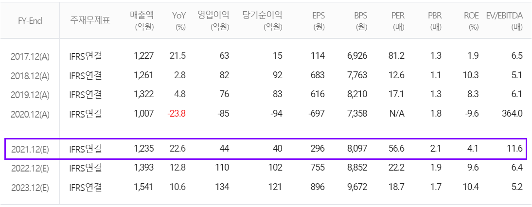 2021년 연간 예상실적에서는 매출액 1,235억 원으로 전년 대비 22.6% 증가하고, 영업이익은 44억 원, 당기순이익 40억 원으로 흑자 전환을 추정하고 있습니다. 자동차 전방 산업의 수요 회복 및 현재 90% 이상 외국산에 의존하고 있는 차량용 MCU 국산화에 따른 신규 매출원이 기대되면서 당분간 꾸준한 성장세를 전망하고 있습니다.