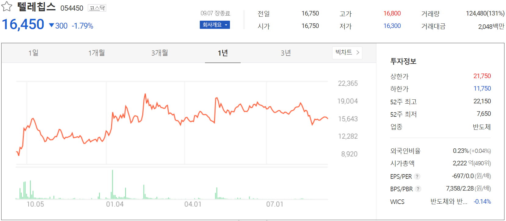 9월 7일 장 종료 기준 당사의 주가는 전일보다 1.79% 내린 16,450원에 거래를 마감했습니다. 외국인 비중은 0.23%이며 시가 총액 2,222억 원으로 코스닥 시총 기준 490위 종목입니다.