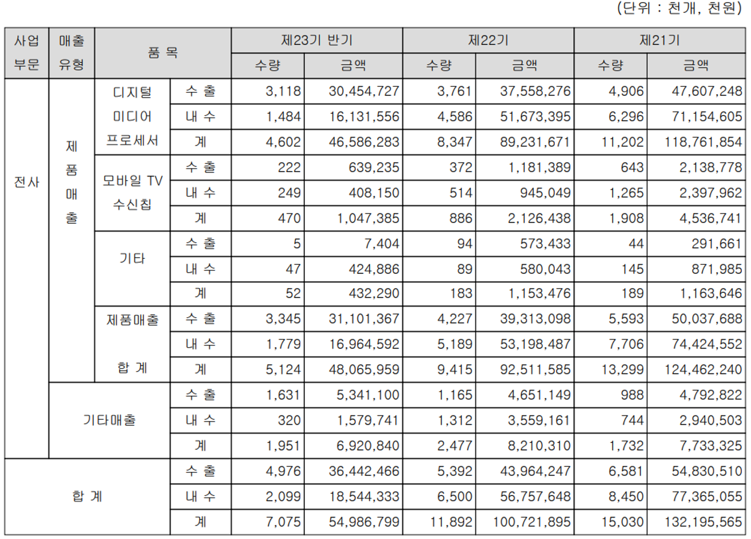 당사는 반도체 팹리스(Fabless) 업체로서 스마트기기, 오디오, 비디오, 카메라 등 디지털 미디어 프로세서(DMP)가 필요한 멀티미디어 부문과 모바일 방송용 통신 칩 등의 설계 및 개발을 전문으로 합니다. 지난 상반기 DMP 부문 매출은 466억 원으로 전체 매출의 84.72%를 차지하였으며, 모바일 수신 칩의 매출은 10억 원으로 1.9%의 매출 비중을 기록했습니다.
