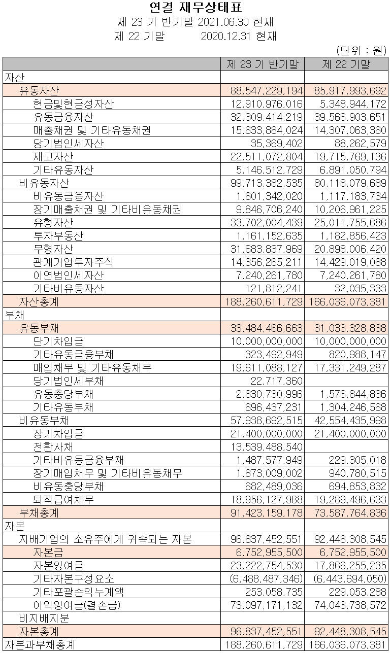 지난 상반기 말 기준 자산 총계는 전기 말보다 13.4%(222억 원) 늘어난 1,883억 원으로 현금 및 현금성 자산과 유무형 자산의 증가에 기인합니다. 부채 총계는 24.2%(178억 원) 증가한 914억 원으로 매입채무 및 기타유동채무의 증가가 주 요인입니다.
