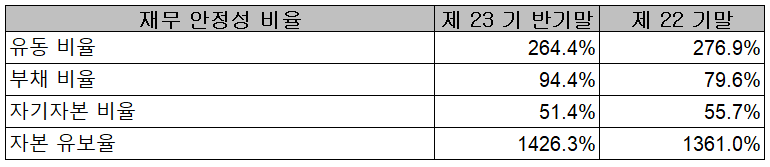 2021년 6월 30일 현재 재무 안정성 비율에서는 유동비율 264.4%, 부채비율 94.4%, 자기자본비율 51.4%, 자본유보율 1,426.3% 를 기록하면서 전반적으로 양호한 재무상태를 유지하고 있습니다.