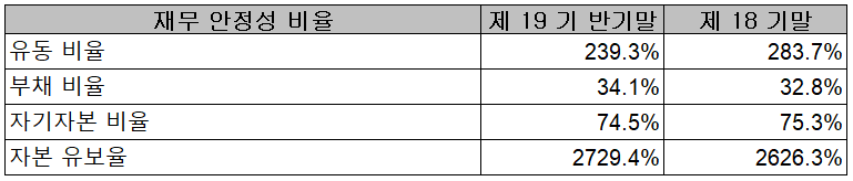 2021년 상반기 말 현재 재무안정서 비율에서는 유동비율 239.3%, 부채비율 34.1%, 자기자본비율 74.5%, 자본유보율 2,729.4%를 기록하면서 건실하고 안정적인 재무상태를 유지하고 있습니다.