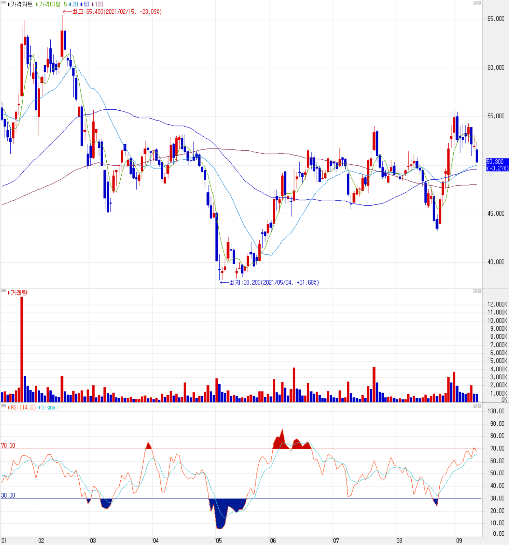 9월 10일 장 종료 기준 당사의 주가는 전 거래일보다 3.27% 내린 50,300원에 거래를 마쳤습니다. 외국인 비중은 13.74%이며, 시가 총액 3조 2,943억 원으로 코스피 시총 기준 106위 종목입니다.