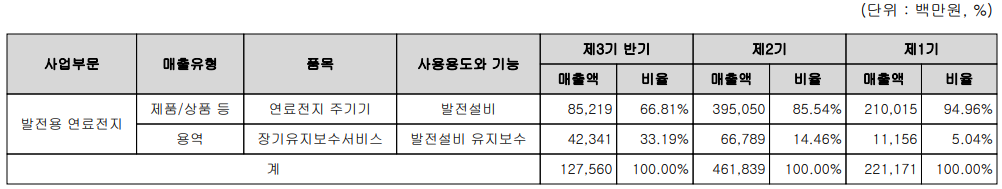 당사는 발전 설비에 적용되는 발전용 연료전지 기기의 공급 및 장기 유지보수 서비스를 제공하고 있습니다. 지난 상반기 연료전지 제품의 매출은 852억 원으로 전체 매출의 66.81%를 차지하였으며, 유지보수 용역의 매출은 423억 원으로 33.19%의 매출 비중을 나타냈습니다.