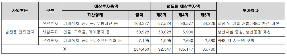 당사는 미래 성장 가속화 및 시장 확보를 위하여 정부 국책 과제로 Tri-Gen 모델을 개발 중에 있으며, 실증 후 상용화될 예정입니다. 이 모델은 분산전원으로써 전기와 열을 공급하는 동시에 도심 내 수소충전소로 기능할 수 있어서 향후 수소경제 이행을 위한 기반 시설로 활용될 것으로 보며, 경쟁사 대비 약점인 발전효율이 떨어지는 부분에 Tri-Gen 모델로 경쟁력을 확보할 수 있을 것으로 보입니다.