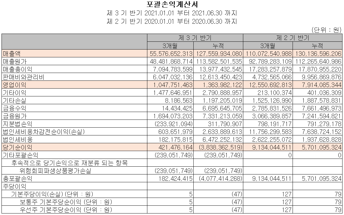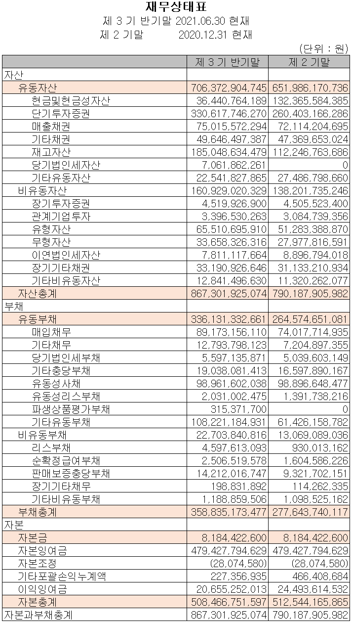 2021년 상반기 말 기준 자산 총계는 전년 동기 말 대비 9.8%(771억 원) 증가한 8,673억 원으로 단기투자증권, 재고자산, 유형자산의 증가에 기인합니다. 부채 총계는 29.2%(812억 원) 증가한 3,588억 원으로 매입채무, 기타유동부채의 증가가 있었습니다. 당기 손실 등으로 자본 총계는 40억 원이 감소한 5,085억 원을 기록했습니다.
